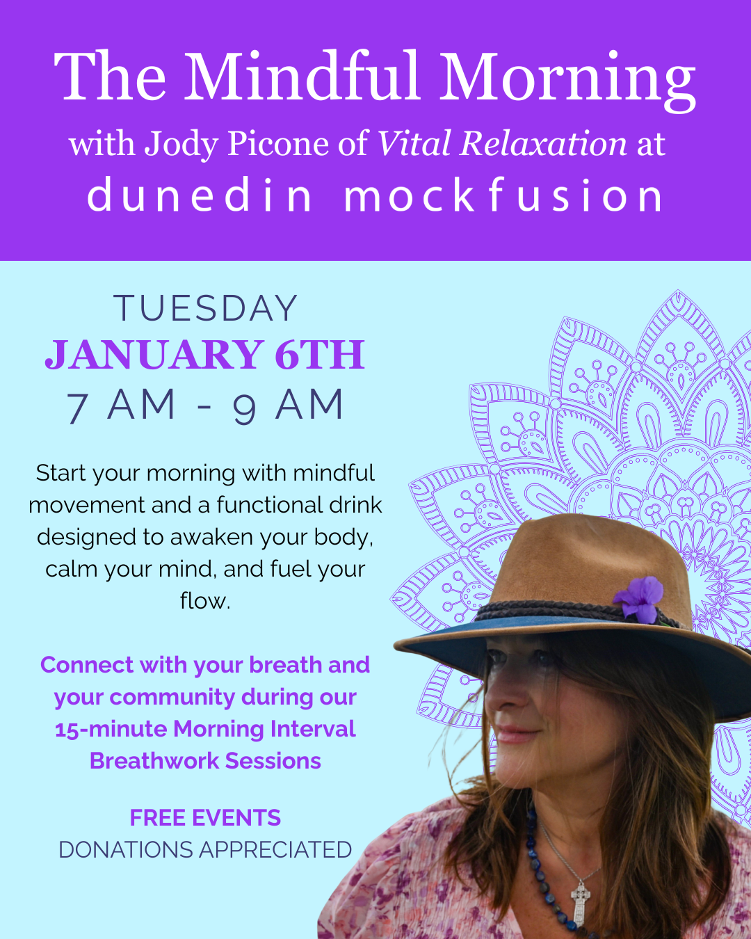 Start the new year with intention and presence at The Mindful Morning with Jody Picone of Vital Relaxation, hosted at Dunedin MockFusion on Tuesday, January 6th from 7–9 AM.